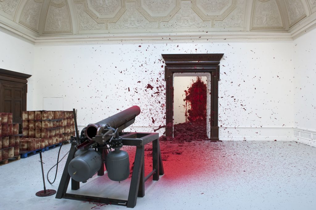 Ahora, si de sorpresas se trata en Disparando en la esquina (2008-2009), vemos a un Kapoor que propone una obra cargada de simbolismos, donde tenemos este cañón como un elemento fálico que dispara balas de once kilos de cera roja símbolo de la sangre y la tierra hacia una esquina sufriente que no es otra cosa que la figura femenina que evoca la vulneración y la violencia ejercida, no sólo por siglos, sino por algo que está sucediendo en vivo, ante un grupo de impávidos testigos que son prontamente remecidos por la injusta descarga.